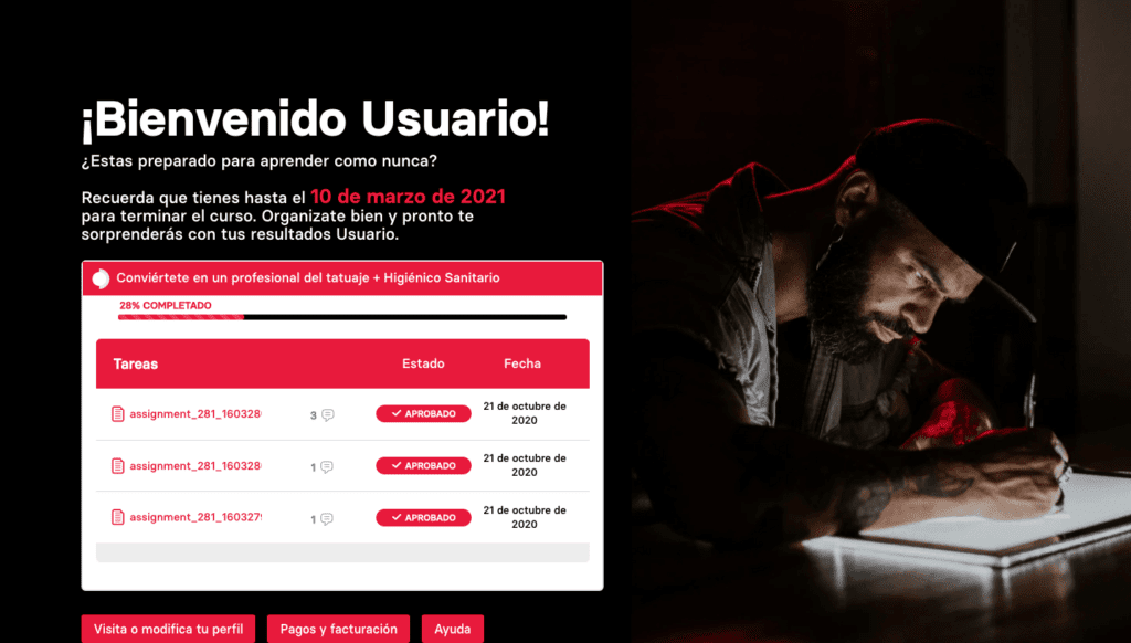 El curso consta de 9 unidades didácticas en las que aprenderás todos los entresijos y conceptos para lograr un manejo perfecto de la técnica para tatuar. En cada unidad realizarás diferentes ejercicios prácticos que serán evaluados por nuestros profesionales y al final de cada lección habrá varias evaluaciones prácticas que será calificada, de manera que no podrás avanzar al siguiente modulo hasta no ser calificado como apto.