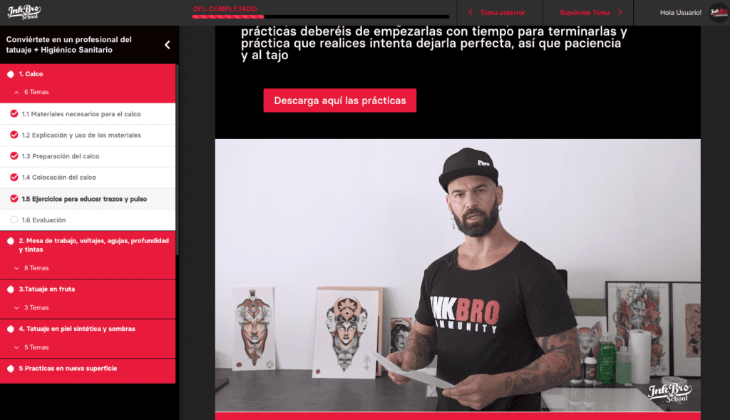 Nuestro temario está estructurado en 8 lecciones claras y concisas. Empezando por cómo preparar el calco de tus diseños y terminando con un proyecto final en el que deberás realizar un tatuaje tú solo, de principio a fin, sobre una persona. En medio de ese proceso aprenderás técnicas para realizar líneas, sombras y color.