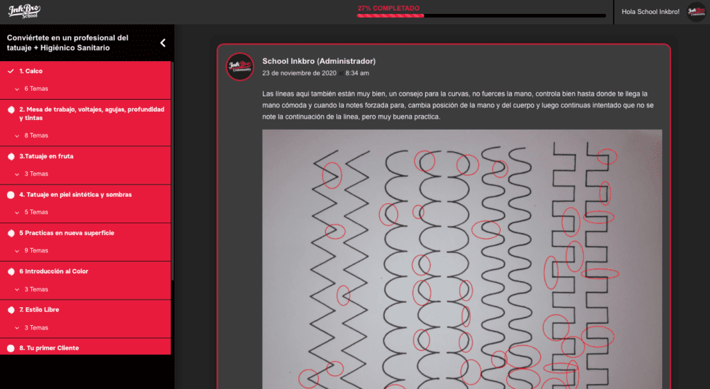 Así nos aseguramos de que hayas entendido y aplicado todos los conceptos prácticos correctamente. Es la única manera de ofrecer una enseñanza real en el mundo del tatuaje: acompañándote en cada práctica e indicándote tanto tus errores, para que aprendas de ellos como tus virtudes, para que las refuerces.